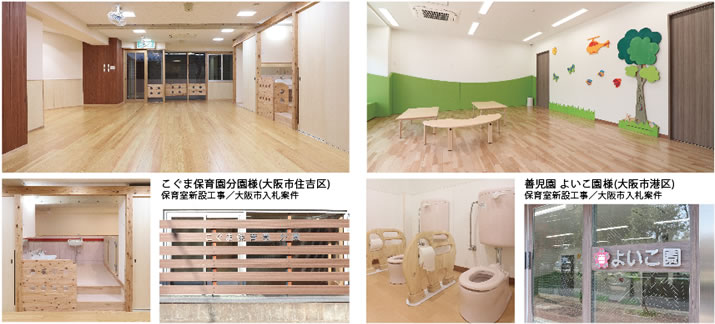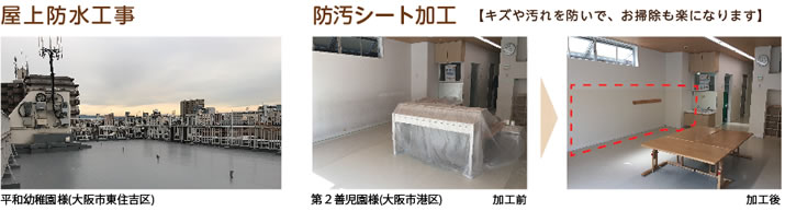 傷んだ床や壁の「屋内メンテナンス」経年劣化に伴う「屋上防水・外壁塗装」大阪府・大阪市入札案件による「園舎新設工事」まで経験豊富なスタッフがお手伝いさせて頂きます。